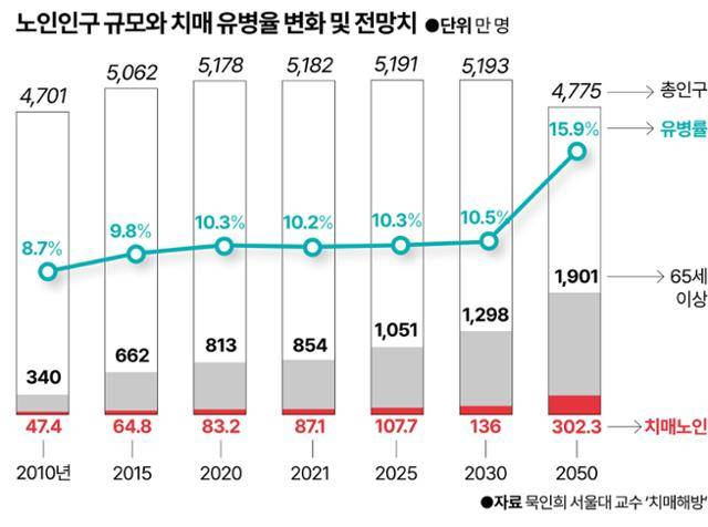알츠하이머병은 치매 상태를 부르는 가장 흔한(75% 이상) 질환이다. 혈관이 파손돼 치매에 이르는 경우와 희소 유전적 질환에 기인해 치매에 이른 경우는 15% 이하로 추계된다. 대략적인 국내 치매 환자(65세 이상) 규모는 96만1,000여 명(정부발행 2025치매백서)에 달한다. 65세 이상 전체 인구 946만여 명에 비하면 유병률은 10.3% 수준이다. 동일 연령대 암성 질환 평균 유병률(14.5%)에 미치진 않지만, 완치가 불가능한 예후를 놓고 보면 치매가 국민 건강에 끼치는 영향이 더 심대하다. 치료와 요양에 드는 총 비용(환자 1명당)은 연간 2,639만 원으로 추정된다. 이렇게 따지면 매년 국내에서 이들 환자 모두에게 들어가는 비용은 무려 23조 원에 육박한다. 개인 부담액은 물론 건강보험재정에도 커다란 손실이다. 정부가 내놓는 치매 장래 추계치를 보면 더 암울하다. 2070년 65세 이상 국내 치매 환자는 223만8,000여 명으로 추정된다. 이들에게 드는 비용도 215조 원에 이른다.