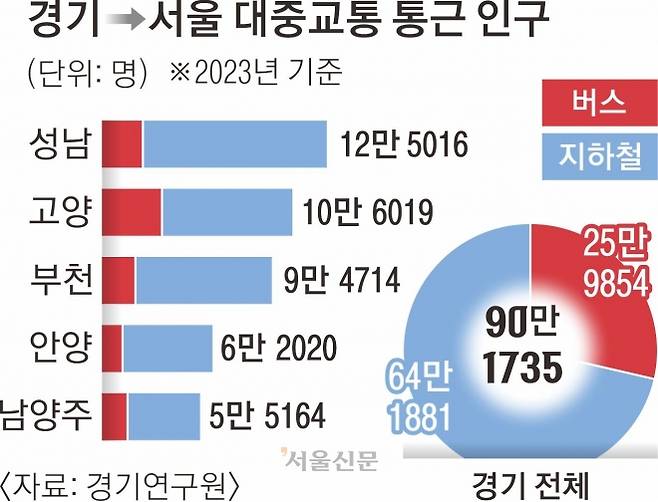 2024년 경기연구원이 발간한 ‘포스트 코로나 시대 통근 형태 변화’ 보고서에 따르면 경기도 31개 시군에서 대중교통을 이용해 서울로 통근·통학하는 사람은 90만 735명에 이른다. 서울과 맞닿은 성남과 고양, 부천, 안양, 남양주 시민이 절반가량을 차지한다. 또 경기도에서 서울까지 출퇴근 시간이 78분(편도·대중교통 기준) 걸려 서울 내 출퇴근(35분)보다 2배 이상 소요되는 것으로 분석됐다. 인천(15만 5000명)까지 합치면 수도권의 서울 통근 규모는 100만명을 훌쩍 넘긴다.
