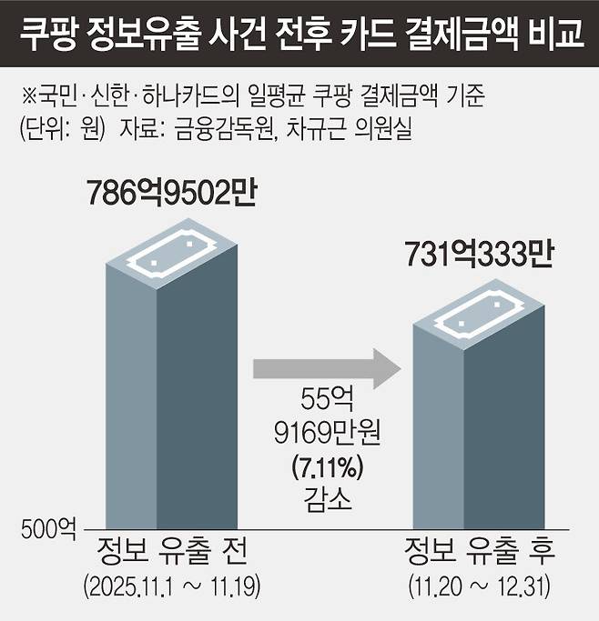 쿠팡의 대규모 개인정보 유출 사태 이후 한 달여 동안 카드 결제 금액이 하루 평균 56억원씩 감소한 것으로 나타났다.