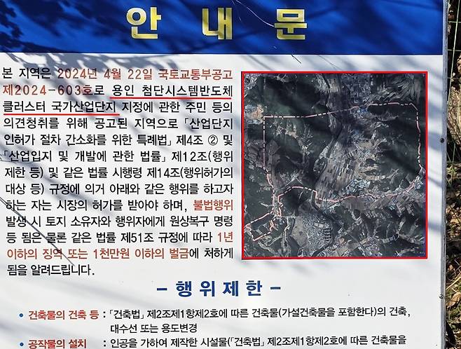 | ▲ LH와 용인시가 세운 삼성전자 반도체 공장이 들어설 국가산업단지 안내문, 예정지 좌우에 산이 위치하고 있다. |