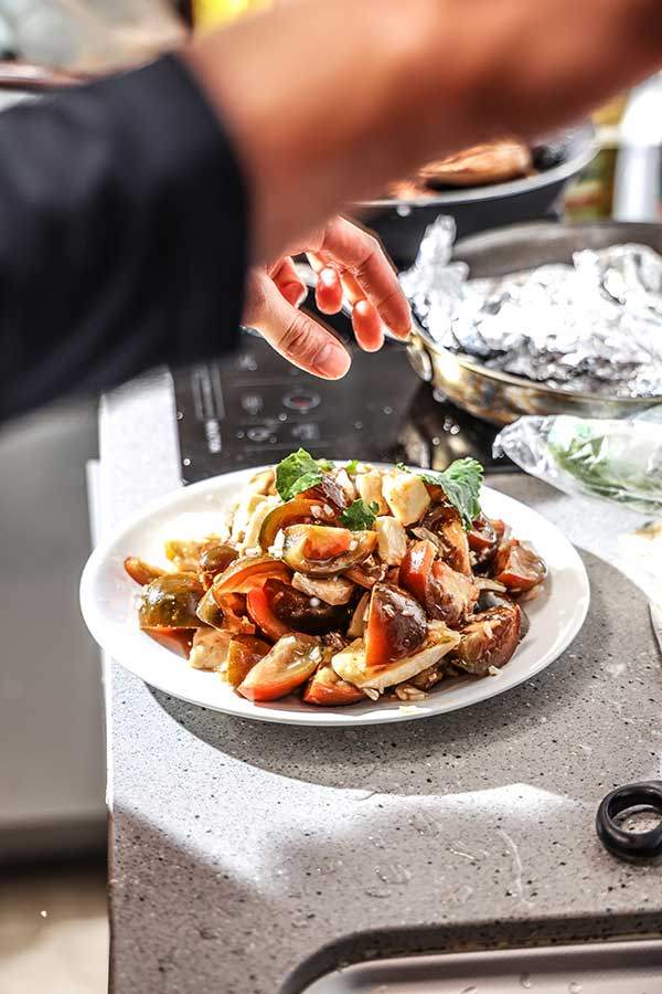 크라포딘 아래에는 창고에 남아 있던 감자, 고구마를 깔았다. 닭과 함께 구워 닭기름으로 천천히 익힌다. 브리 치즈와 함께 낸 흑토마토 샐러드 위에는 바질 대신 현지 시장에서 산 취나물을 올리겠다고 했다. 순식간에 계획을 세운 김 셰프가 현란하게 요리에 들어갈 때 레인저들과 대화를 나눴다. 주제는 먼저 음식.