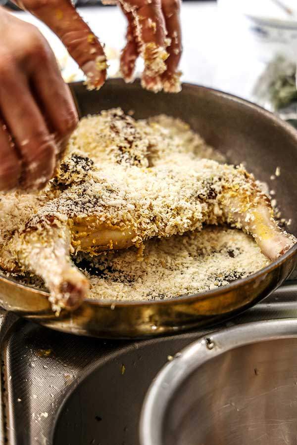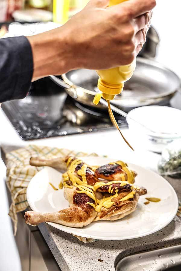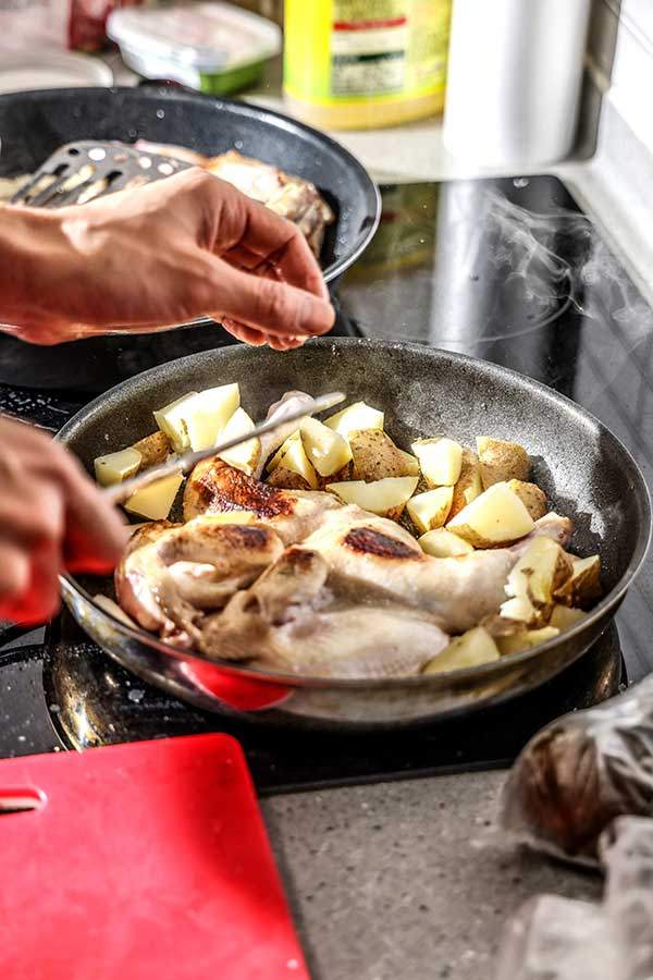 닭 전체가 들어갈 만한 크기의 팬에 식용유를 넉넉히 두르고 뼈 부분부터 열을 가하다가 뒤집어 살을 익힌다. 기름에 버터 한 수저를 넣고 허벅다리와 두꺼운 가슴살 주변에 끼얹어 가며 15분 정도 익힌다. 한 번에 익히려고 하지 말고 3분의 1 정도 익었을 때 꺼내 10분 이상 쿠킹 호일을 덮어 레스팅을 시킨다.