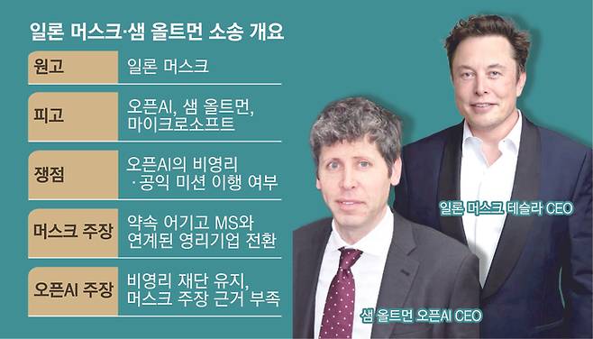 소장에서 머스크는 올트먼이 구글의 딥마인드에 맞설 비영리 AI 연구소를 만들자며 자신을 설득했고 AI 기술을 오픈소스로 공개해 인류에 이바지하겠다는 비전을 제시했다고 밝혔다. 머스크는 이 과정에서 약 4000만달러를 출연한 것으로 알려졌다. 그러나 이후 오픈AI 경영진이 조직 구조를 재편하고 영리 법인을 설립했으며 수십억 달러 규모의 투자와 계약을 체결해 애초 공익 미션을 위반했다는 것이 머스크 쪽 주장이다.