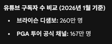 요즘 그의 유튜브 조회수와 인기로 보면 불가능한 것도 아니다. 결국 칼자루는 디섐보가 쥐고 있으며, 이번 전쟁의 최종 승자는 그가 될 가능성도 크다.