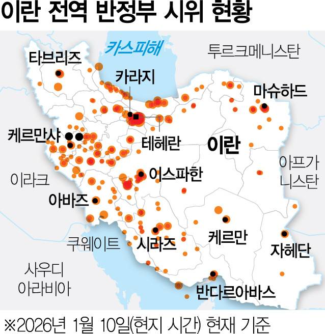 이란에서 경제난으로 촉발된 반정부 시위가 3주째 이어지는 가운데 정부의 강경 진압으로 사상자가 수천~수만 명이 발생하는 등 유혈 사태가 걷잡을 수 없이 번지고 있다. 아야톨라 알리 하메네이 최고지도자를 중심으로 한 신정 독재 정권이 47년 만에 흔들리면서 도널드 트럼프 미국 행정부도 적극적인 개입 의사를 내비치고 있다. 트럼프 행정부는 외교·경제적 수단을 우선 동원하면서 사태가 크게 확산할 경우 군사 행동 카드까지 검토하겠다는 입장이다. 지난해 말 우크라이나 종전 협상 부진, 니콜라스 마두로 베네수엘라 대통령 체포로 상승하기 시작한 국제 유가도 이란 사태까지 겹친 탓에 어느덧 배럴당 60달러 위에서 요동치고 있다. 주요 외신들은 다만 인근 미 해군 항공모함 부재, 표적 공습의 어려움 등을 들어 이란에 대한 미국의 군사 작전이 쉽지 않을 것이라고 내다보고 있다. 트럼프 대통령도 갑자기 “처형 계획은 없다고 들었다”며 무력 사용 가능성에 선을 긋고 나섰다. 새해 들어 각종 지정학적 위험이 잇따르는 가운데 이란 사태도 트럼프 대통령의 결단에 따라 향방이 갈릴 전망이다. 11월 3일 미국 중간선거를 앞두고 대외 치적을 쌓으려는 트럼프 대통령이 ‘돈이 아까우니 다른 나라 일에는 관여하지 않겠다’는 기존 입장을 뒤집고 있다는 점이 변수가 될 수 있다는 뜻이다.