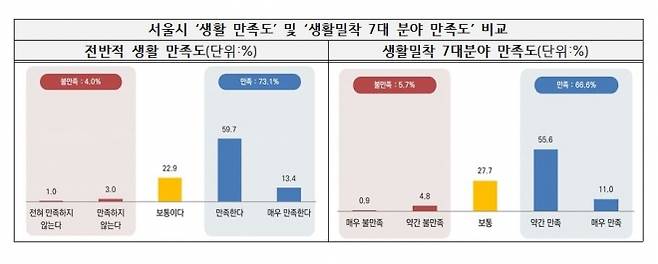 조사 결과, 서울시 전반적인 생활에 대한 만족도는 응답자의 73.1%가 ‘만족한다’ 고 응답하였으나, 생활밀착 7대 분야에 대한 만족도 결과에서는 응답자 중 66.6%가 만족하고 있는 것으로 나타나, 생활밀착 분야에서의 개선 필요성이 있는 것으로 조사됐다.