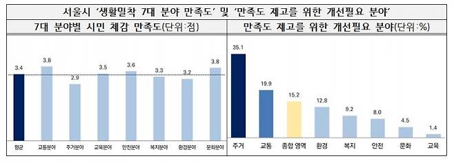 7대 분야별 시민 체감 만족도를 살펴보면, ‘교통’과 ‘문화’ 분야가 각각 3.8점(5점 만점)으로 가장 높았고, ‘주거’(2.9점)와 ‘환경’(3.2점) 분야는 다소 낮은 점수를 얻었다. 이어, 시민들은 생활 만족도 제고를 위한 가장 개선이 필요한 분야로 ‘주거’(35.1%)를 꼽았으며, ‘교통’, ‘환경’, ‘복지’ 등이 그 뒤를 이었다. ‘교통’ 분야는 시민 체감 만족도 결과에서는 상위값을 차지했음에도 불구하고 개선 필요성 또한 높게 지적된 것으로 조사되었다.