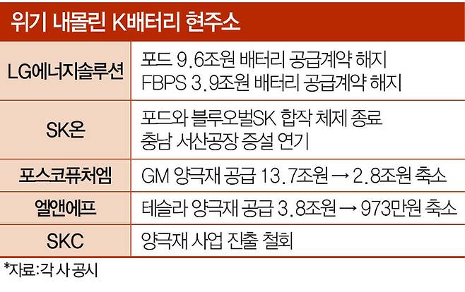 국내 1위 전기차 배터리 업체 LG에너지솔루션 사정은 더 심각하다. 미국 포드(9조6030억원), FBPS(3조9217억원)로부터 줄줄이 계약 해지 통보가 날아왔다. 무려 13조5000억원에 달하는 물량이다. 포드가 전기 픽업트럭 생산을 중단하고, 배터리관리시스템(BMS)과 배터리 팩을 제조하는 미국 FEBS의 자회사 FBPS가 전기버스 사업을 철수하기로 한 탓이다.