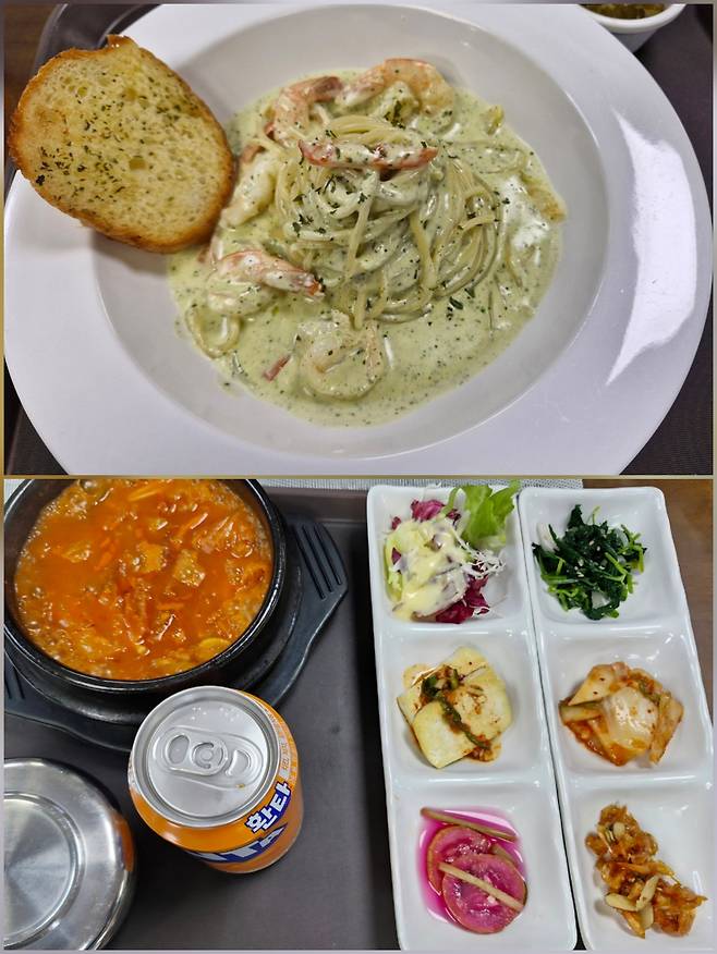 | ▲ 진남휴게소에서 주문한 바질크림새우스파게티와 김치찌개 그리고 밑반찬 |