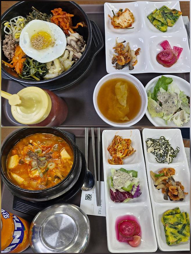 | ▲ 진남휴게소에서 주문한 순두부찌개와 돌솥비빔밥. 밑반찬은 리필 코너에서 양껏 덜어 먹는 휴게소 |