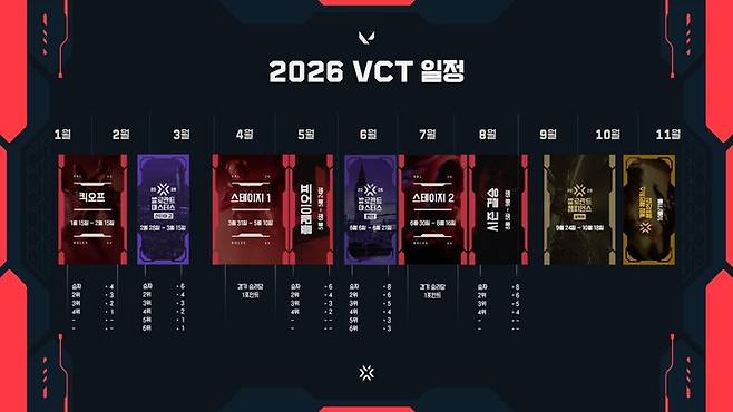 라이엇 게임즈는 2026 시즌의 운영 일정 및 방식을 15일 공개하며 킥오프, 스테이지 1·2, 챔피언스 상하이까지 이어지는 전체 일정을 발표했다.