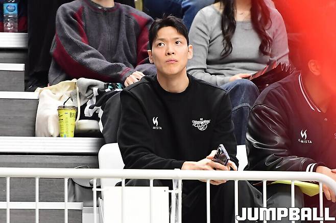 김선형은 14일 수원 KT 소닉붐 아레나에서 열린 부산 KCC와의 2025-2026 LG전자 프로농구 정규시즌을 관중석에서 지켜보며 동료들을 응원했다. 6위 KT는 5위 KCC를 107-95로 제압, 승차를 0.5경기로 줄이며 올스타 브레이크를 맞았다.