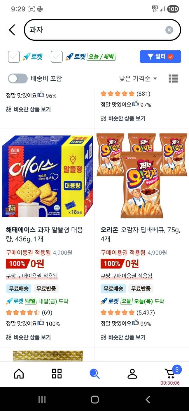 실제 쿠팡 앱에서는 5000원 쿠폰이 자동 적용돼 '0원' 또는 '초저가'가 된 상품들이 대거 등장했다.