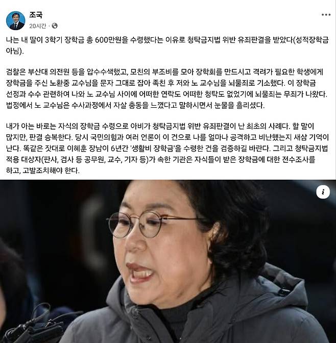 조 대표는 자신의 페이스북에 이혜훈 후보자 장남 관련 보도를 공유하며 “나는 내 딸이 3학기 장학금 총 600만 원을 수령했다는 이유로 청탁금지법 위반 유죄 판결을 받았다"며 "당시 국민의힘과 여러 언론이 당시 이 건으로 나를 얼마나 공격하고 비난했는지 새삼 기억난다”고 주장했습니다.