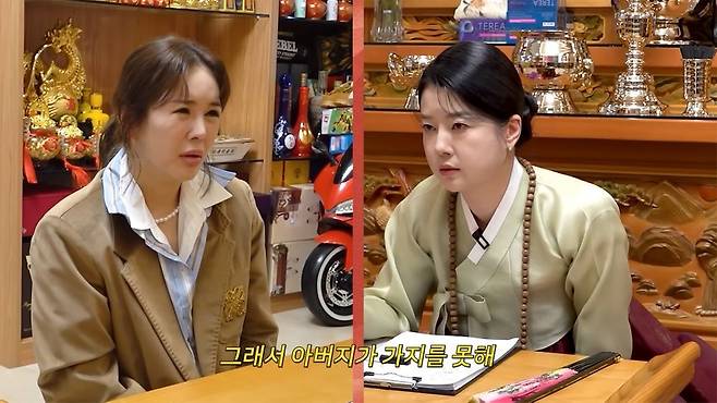 이다영은 "아버지 가신 세월 10년 넘어 15년이 넘어가면 많이 도와주러 올 거다. 지금은 아버지가 너무 아프다. 그 좋던 덩치가 살이 다 빠지고 뼈밖에 없다"고 말하자 장영란은 "어머 아직도"라며 오열했다. 이다영은 "아버지 물건이 아직 집에 너무 많이 남았나 보다. 그래서 아버지가 가지를 못한다. 다 태워드렸으면 좋겠는데 그러면 엄마 마음도 그렇고 네 마음도 그렇고 다 흐트러지니 엄마가 그 집에서 안 아프려면 친정집을 옮겨야 한다"고 조언했다.