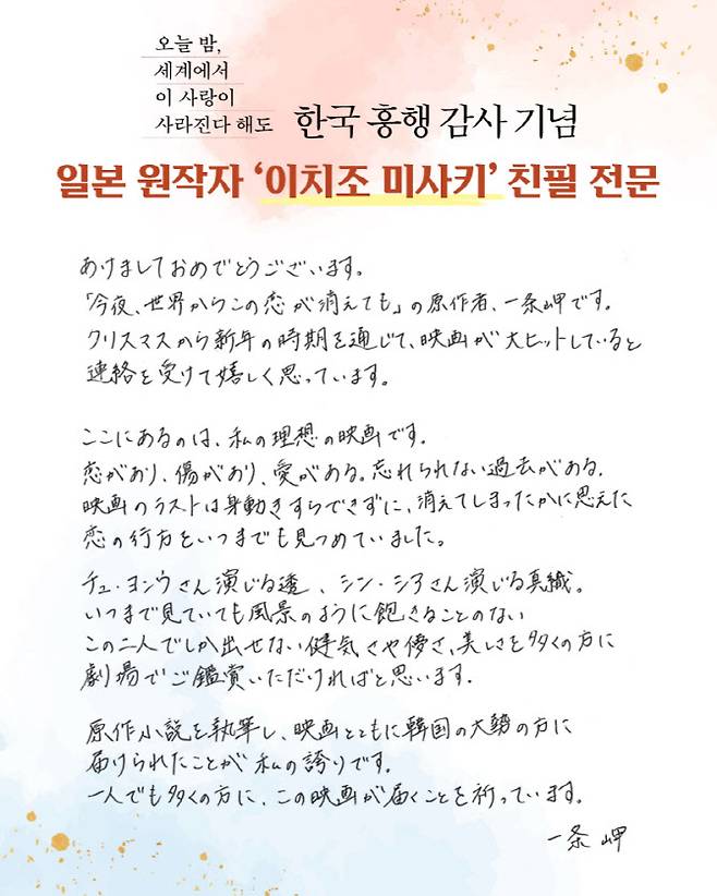 [이데일리 스타in 김보영 기자] 올 겨울 관객들에게 가슴 시린 사랑의 기억을 남길 청춘 멜로 영화 ‘오늘 밤, 세계에서 이 사랑이 사라진다 해도’(감독 김혜영, 오세이사)가 흥행 돌풍을 일으키고 있는 가운데, 일본 원작자 이치조 미사키가 한국 관객들에게 직접 보낸 흥행 감사 인사 전문을 공개했다.