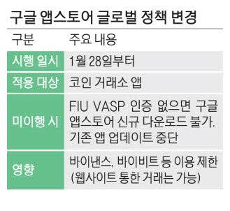 글로벌 앱 마켓 공룡인 구글이 한국 금융당국의 인가를 받지 않은 해외 가상자산(가상화폐) 거래소들에 대해 '앱 마켓 퇴출'이라는 초강수를 뒀다.