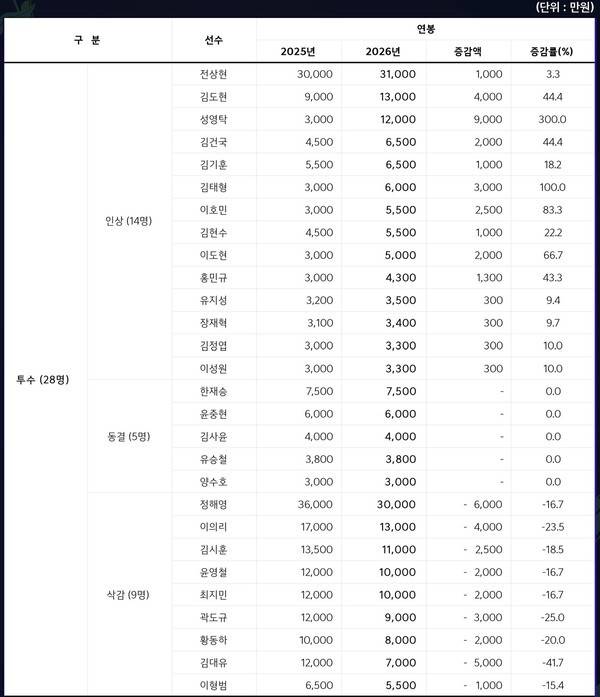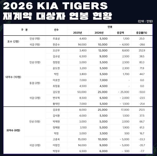 KIA 타이거즈는 15일 "2026시즌 연봉 재계약 대상자 48명과 계약을 마무리했다. 인상된 선수는 25명이, 동결은 7명, 삭감은 16명"이라고 밝혔다.
