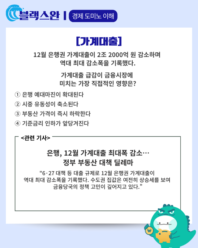 ■ 가계대출 급감세: 정부의 '6·27 대책'과 대출 총량관리로 지난해 12월 은행권 가계대출이 2조 2000억 원 감소하며 동월 기준 역대 최대 감소폭을 기록했다. 은행 주담대도 2023년 2월 이후 2년 10개월 만에 처음으로 줄어들었다.
