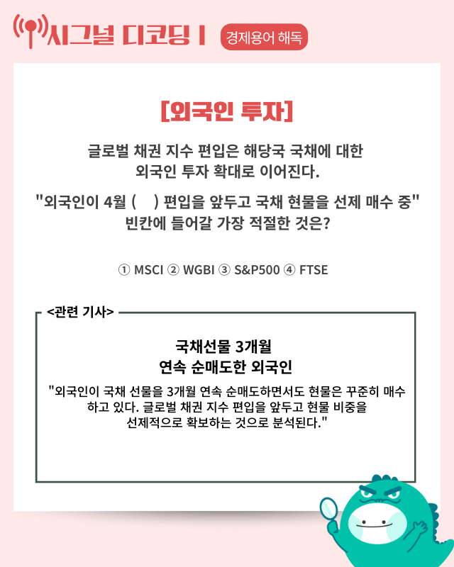 ■ 외국인 채권 엇갈림: 외국인이 국채선물을 3개월 연속 순매도한 반면 현물은 지난달 16조 4208억 원을 순매수하며 상반된 흐름을 보였다. 올해 4월 세계국채지수(WGBI) 편입을 앞두고 현물 비중을 선제적으로 늘리는 것으로 분석된다.
