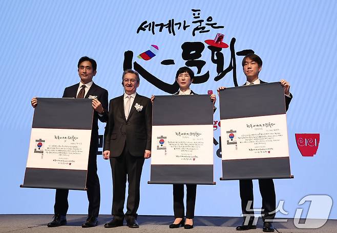 (서울=뉴스1) 김성진 기자 = 15일 서울 강남구 웨스틴 서울 파르나스에서 열린 제22회 한국이미지상 시상식에서 부싯돌상을 수상한 차인표 작가(맨 왼쪽), 조약돌상을 수상한 김정수 삼양식품 부회장(오른쪽에서 두 번째), 디딤돌상을 수상한 정경인 더블랙레이블 대표가 기념촬영을 하고 있다. 2026.1.15/뉴스1
