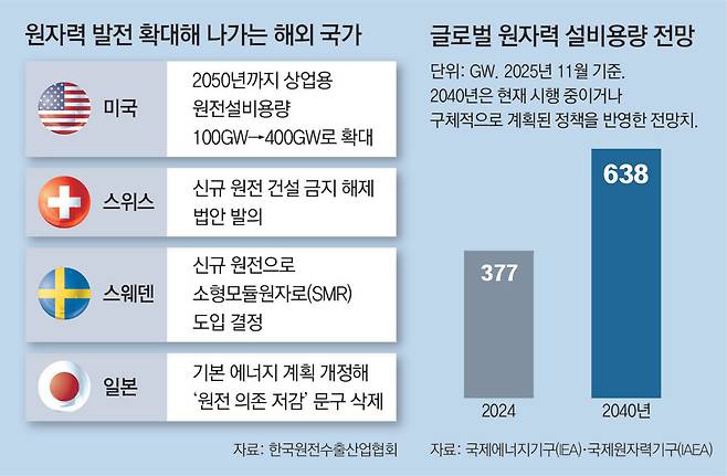 한국원전수출산업협회에 따르면 국제에너지기구(IEA)는 지난해 11월 발표한 ‘세계 에너지 전망 2025’에서 2040년까지 세계 원자력 설비용량이 638GW로 확대될 것이라고 전망했다. 국제원자력기구(IAEA)가 집계한 현재 설비용량인 377GW보다 70% 이상 커지는 것이다. 현재 각국이 실행 중인 계획이나 구체적으로 결정된 계획이 실행되는 것을 가정한 전망치다.