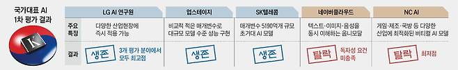 과학기술정보통신부는 15일 “벤치마크(AI 모델 성능) 평가 40점, 전문가 평가 35점, 사용자 평가 25점을 종합한 결과에서 LG AI 연구원, SK텔레콤, 업스테이지 등 3팀이 2단계 평가에 진출했다”고 밝혔다. 벤치마크 평가, 전문가 평가, 사용자 평가에서 모두 LG AI연구원이 1위를 차지했다. NC AI는 AI 모델 성능 평가 점수가 가장 낮았다.