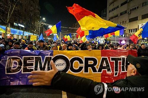 People carry a banner reading "Democracy" and wave Romanian flags as they protest against government austerity measures in Bucharest, Romania, Thursday, Jan. 15, 2026. (AP Photo/Andreea Alexandru)