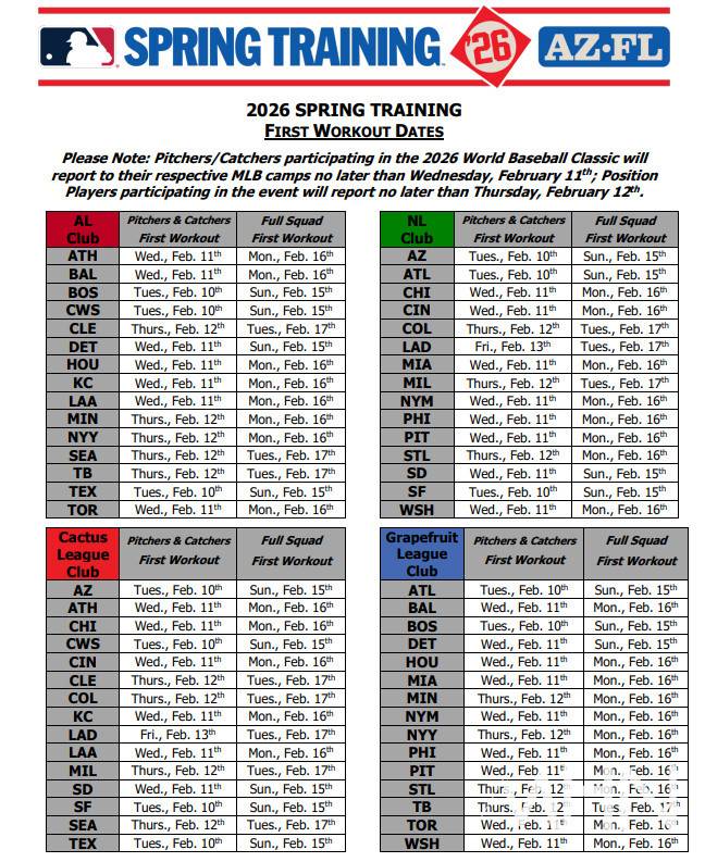 메이저리그 사무국은 15일(한국시간) MHN에 보내온 보도자료를 통해 '2026 메이저리그 스프링캠프 일정'을 발표했다. 메이저리그 스프링캠프는 미국 애리조나주와 플로리다주 두 곳에서 열린다.