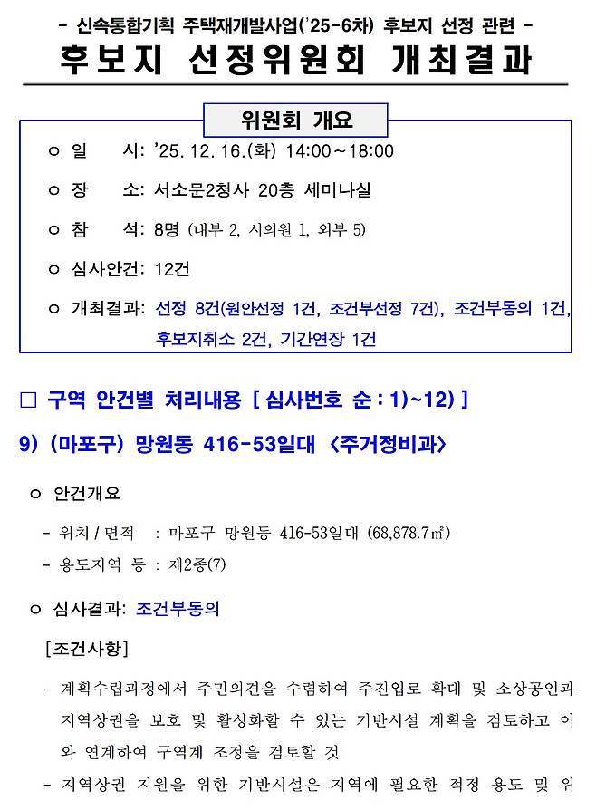 그러나 서울시는 이미 수 년 간 선정위원회 논의 결과를 재개발 지역 선정의 결과로 제시해왔다. 서울시 보도자료를 보아도 "12월 중 '선정위원회'를 열어 후보지를 최종 선정한다"(2021.09.23.), "선정위원회 거쳐 최종 선정"(2022.08.29.), "선정위원회를 개최하여 8곳을 신속통합기획 후보지로 선정했다"(2024.08.28.) 등, 전문가들로 이루어진 선정위원회의 판단을 앞세워, 행정 결정의 정당성을 위원회에 기대어왔다. 그렇다면 선정위원회의 논의가 시의 결정에 이르기까지의 절차를 기록하는 것이 중요하다. 전문가 위원회의 판단을 결정의 근거로 삼았다면 그 논의 과정을 투명하게 공개하고 책임져야 마땅하다. 그렇지 않다면 이는 전문가의 권위만 이용하고 책임은 회피하는 행정편의주의라는 지적을 피하기 어렵다.