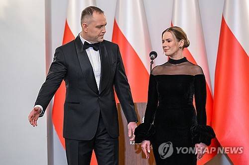 epa12652257 Polish President Karol Nawrocki (L) and Polish First Lady Marta Nawrocka (R) during a New Year's meeting with heads of diplomatic missions accredited to the Republic of Poland at the Presidential Palace in Warsaw, Poland, 15 January 2026. EPA/Radek Pietruszka POLAND OUT