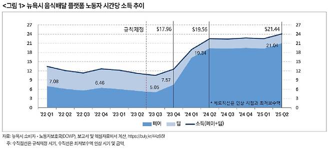 법이 시행되기 이전이던 2023년 2분기에 배달노동자들이 플랫폼업체로부터 받는 시간당 보수(pay)는 5.49달러에 불과했다. 여기에 소비자들이 부담하는 시간당 약 5.70달러의 팁을 합쳐도 시간당 총소득은 11.19달러 수준에 머물고 있었다.