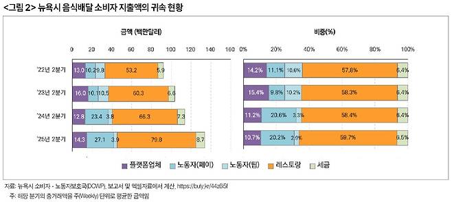 그렇다면 뉴욕시민들은 음식배달앱에 어느 정도의 돈을 지출하고 있고, 이 돈은 어떻게 나눠지고 있을까? <그림2> 참조 2025년 2분기 기준, 뉴욕시에서 음식배달 주문에 지불된 금액은 주당 평균 1억3천370만 달러(약 1천830억원)였다. 연간으로 환산하면 59억 달러, 원화로 8.2조 규모이다. 이 중에서 플랫폼업체가 가져간 돈은 1천430만 달러(10.7%)였고, 레스토랑에 지불된 금액은 7천980만 달러(59.7%)였으며, 세금으로 870만 달러(6.5%)가 지불된 것으로 나타난다. 노동자들에게 최종 돌아간 것은 플랫폼업체가 지불한 보수 2천710만 달러(20.2%)와 소비자들이 직접 지불한 팁 380만 달러(2.9%)를 합쳐서 총 3천90만 달러(23.1%)였던 것으로 확인된다. 2023년 2분기 대비 비중 변화를 계산하면 플랫폼업체의 비중이 –4.8%포인트 감소하고 레스토랑 몫이 1.4%포인트 늘어났는데, 노동자들에게 돌아간 몫은 3.2%포인트 늘어났다.