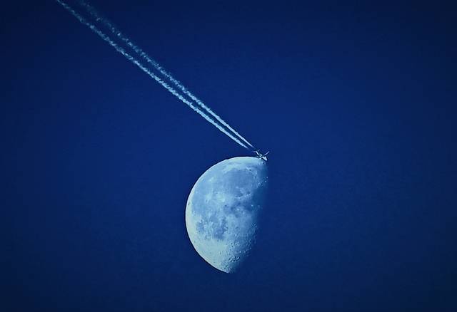달의 이마를 스치듯 비행기의 궤적이 지나간다. 사실 서로 아무 상관도 없는 거리에서 부유하지만 사진 속에서는 마치 한 점에서 만난 듯하다. 비행기가 달에 착륙이라도 할 것처럼 잠시 설레며 헛된 기대를 해보지만 둘은 그저 잠시 스쳤다가 각자의 궤도를 따라 지나간다. 우연이라 하기엔 정교하고, 운명이라 부르기엔 덧없는 찰나다. 인간이 만든 작은 기계가 거대한 우주의 바위를 배경으로 잠시 겹친 이 장면은 지구의 자전과 달의 공전, 비행로가 맞물린 한순간의 행운이다.