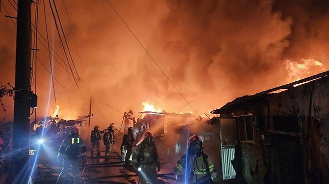 [16일 오전 5시께 서울 강남구 개포동 구룡마을 4지구에서 불이 났다. 소방 당국은 인근 야산으로 불이 번질 우려가 있다고 보고 5시 10분께 대응 1단계를 발령했다. 사진은 이날 화재 현장 모습. (서울소방재난본부 제공=연합뉴스)]