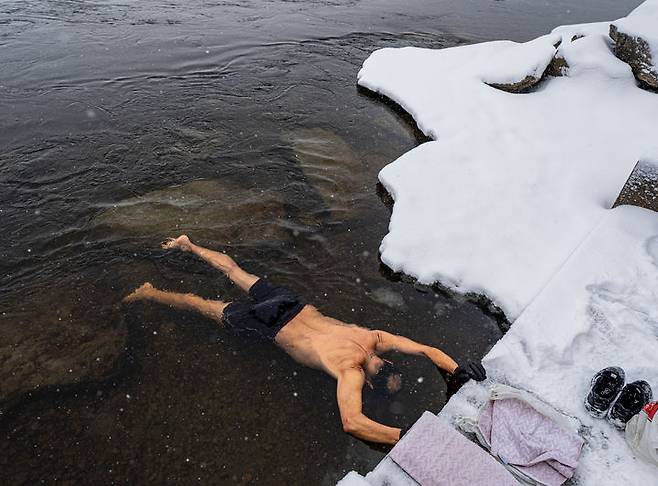 [몬트리올=AP/뉴시스] 15일(현지 시간) 캐나다 몬트리올 외곽 라살에서 한 남성이 세인트로렌스강에 몸을 담그고 있다. 이날 몬트리올에는 10~15㎝의 눈이 예보됐다. 2026.01.16.2026.01.16.
