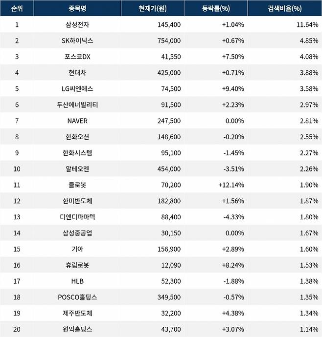 이어 SK하이닉스(000660)가 검색비율 2위를 기록하며 0.67%의 상승세를 보이고 있다. 검색비율 3위의 포스코DX(022100)는 7.50% 상승하며 순조롭게 출발하는 모습이다. 검색비율 4위 현대차(005380)는 개장 초반부터 0.71% 상승하며 안정적인 출발을 하고 있다. 검색비율 5위 LG씨엔에스(064400)는 9.40% 상승하며 두드러진 움직임을 보이고 있다.