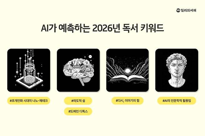 밀리의서재가 꼽은 2026년 독서 시장을 관통할 핵심 키워드는 ▲초개인화 시대의 나노-재테크 ▲의도적 쉼(도파민 디톡스) ▲다시, 이야기의 힘 ▲AI의 인문학적 활용법 등이다.