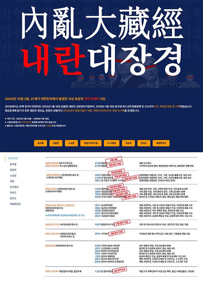 군인권센터는 "웹사이트 명칭은 '내란대장경'으로, 서울중앙지법과 군사법원에서 재판을 받고 있는 주요 내란 피고인의 혐의, 피고인, 날짜별 검색이 가능하다"고 밝혔습니다.