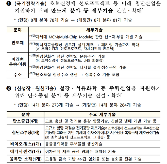이밖에 신성장·원천기술에선 철강·석유화학 등 주력산업을 지원하기 위해 고로 용선 및 전기로 용강 합탕기술, 친환경 냉매 개발 기술과 저탄소 태양광 모듈 설계·제조·활용 등이 새롭게 적용대상이 됐습니다.