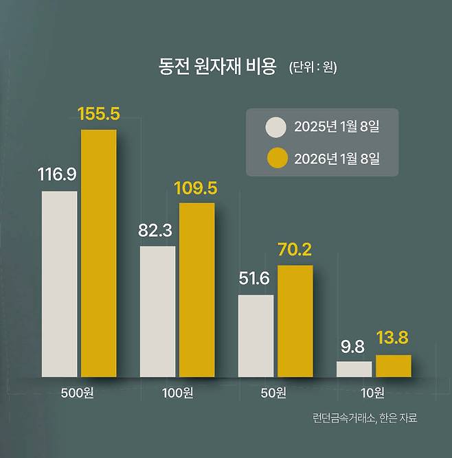 이 가격을 각 시점의 원/달러 환율 시가(각각 1455원, 14553.8원)를 기준으로 원화로 환산해 계산하면 500원 동전을 하나 만드는 데 들어가는 원자재 비용은 1년 새 116.9원에서 155.5원으로 33.1% 오른 것으로 추산된다. 100원은 82.3원에서 109.5원으로 33.1% 올랐고, 50원은 같은 기간 51.6원에서 70.2원으로 36% 올랐다. 10원은 9.82원에서 13.8원으로 40% 오르며 가장 많은 상승폭을 기록했다.