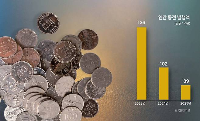 연간 동전발행액은 2002년 1438억6200만원으로, 정점을 찍은 뒤 몇 년간 1000억원 안팎 수준을 이어가다 2017년 495억4000만원으로 떨어진 뒤 본격적으로 줄어들기 시작했다. 2019년에는 364억9100만원으로 400억원이 깨졌고, 바로 다음해(254억7800만원)에는 300억원 아래로 떨어졌다. 2023년부터는 2년간 발행액은 100억원대에 그쳤다.