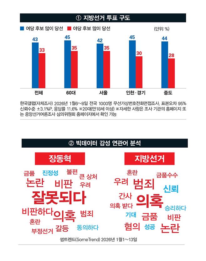 한국갤럽이 1월6일부터 8일까지 실시한 조사(전국 1000명, 무선가상번호 전화면접조사, 표본오차 95% 신뢰수준 ±3.1%p, 응답률 11.6%. 중앙선거여론조사심의위원회 홈페이지 참조)에서 올해 6월 실시되는 지방선거 구도에 대해 물었다. "여당 후보가 많이 당선되는 것이 좋다"는 응답은 43%, "야당 후보가 많이 당선되는 것이 좋다"는 응답은 33%로 나왔다. '여당 후보가 많이 당선되면 좋겠다'는 국정 안정론이 10%포인트(p) 더 높게 나왔다(그림①).