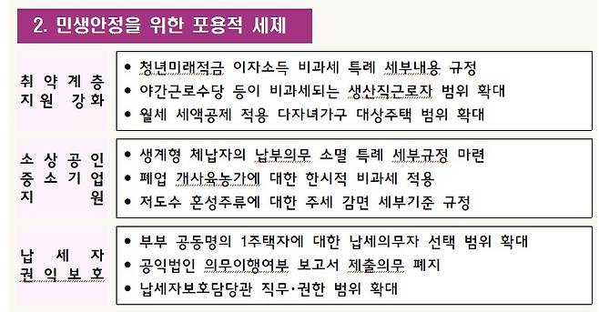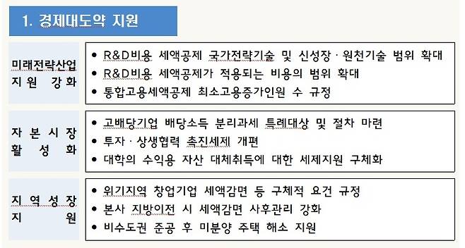또 자본시장 활성화와 벤처투자 촉진을 위한 세제지원도 강화되며, 민생안정을 위한 포용적 세제 추진으로 서민·중산층·다자녀가구와 소상공인 등의 지원도 확대된다.
