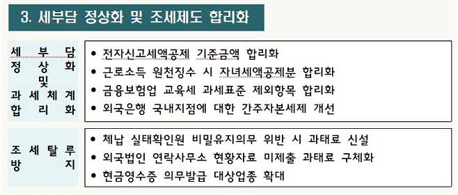 세부담을 정상화하고 과세체계를 합리화한다. 전자신고가 정착된 종합소득세, 법인세 및 부가가치세에 대한 전자신고세액공제 기준금액을 50% 인하한다.