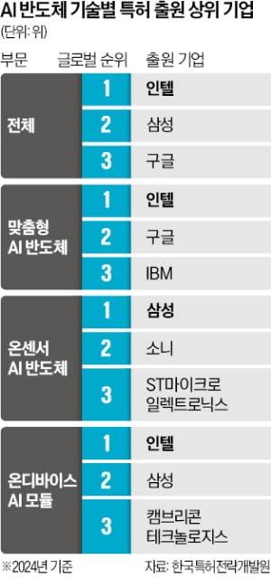 한국은 온센서 AI 반도체에서는 강점을 보이나 산업 맞춤형 AI 반도체에서는 글로벌 상위 10대 출원 기업이 한 곳도 없다.