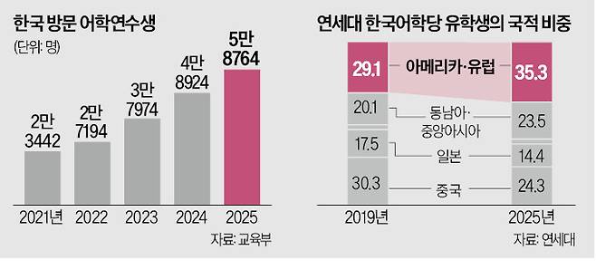 16일 연세대 한국어학당에 따르면 어학당 내 미주·유럽 출신 유학생은 코로나19 이전인 2019년 2143명에서 지난해 3250명으로 51.6% 증가했다. 이 기간 미주·유럽 비중은 29.1%에서 35.3%로 6.2%포인트 상승했다.