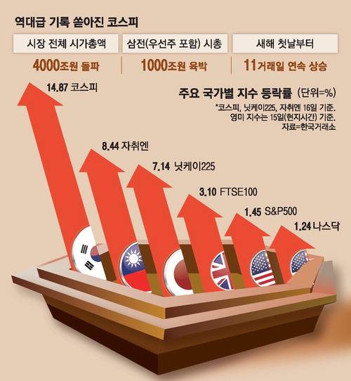 코스피는 새해 들어서도 주요국 증시 가운데 독보적 수익률 1위 자리를 지키고 있다. 지난해 한 해 동안 코스피는 75.63% 상승하며 미국 S&P500지수(17.41%), 일본 닛케이225지수(26.18%), 대만 자취엔지수(22.57%)를 크게 웃돌았다. 올해에는 코스피가 벌써 14.87% 상승률을 나타내고 있다. 코스피를 추격하는 2위 지수인 일본 토픽스(7.33%)도 코스피 상승률의 절반 수준에 그쳤다.