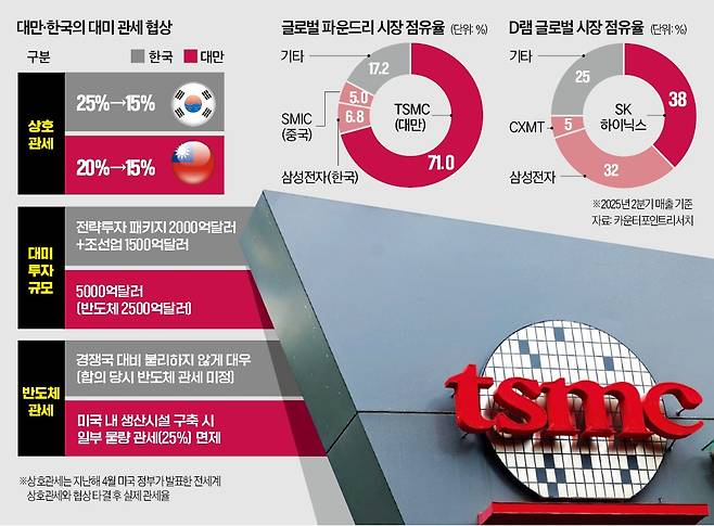 한국 정부는 지난해 미국과 관세협상을 타결하면서 공동 팩트시트에 ‘미국과의 반도체 교역 규모가 한국보다 큰 국가(대만)에 비해 불리한 대우를 하지 않겠다’는 문구를 확보했다. 정부는 “반도체 관세에 대한 사실상의 최혜국 대우”라고 설명했다.