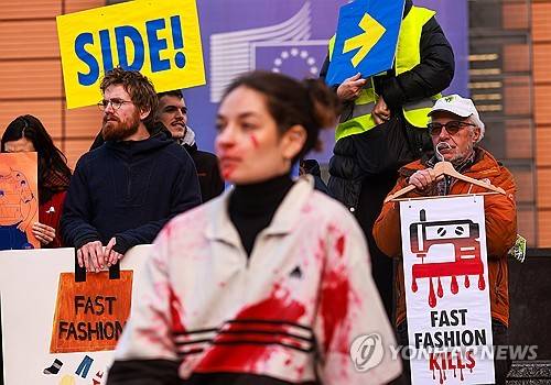 epa12652833 Activists demonstrate against fast fashion outside the European Commission headquarters in Brussels, Belgium, 16 January 2026. Activists are calling on the EU executive not to block France's landmark anti-fast-fashion bill, targeting the 'ultra-fast fashion' model characterized by high volume and rapid turnover, which is currently undergoing a mandatory EU compliance review. The demonstration coincides with high-level meetings between the European Commission and representatives from Shein and H&M. EPA/OLIVIER HOSLET